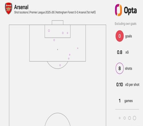 英超第22轮,阿森纳客场对阵诺丁汉森林,上半场阿森纳完成8次射门,但无一射正,射门次数为阿尔特塔治下阿森纳没射...