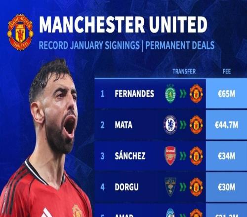 • 德转列曼联队史冬窗最贵引援TOP10:B费、马塔、桑切斯前3
