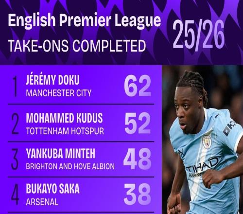 本赛季英超成功过人排名:多库62次居首,库杜斯次席
