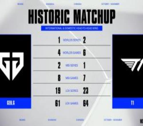 英文流直播间公布GENvsT1历史交手战绩:世界赛大场12