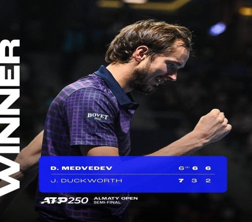 10月18日,ATP250阿拉木图半决赛,2号种子梅德韦杰夫2-1(6-7(8)、6-3、6-2)逆转资格赛球员达克沃斯,第40次闯入巡回赛...