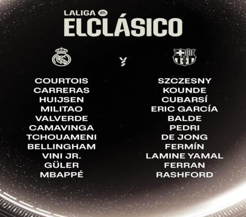 巴萨首发:25-什琴斯尼、23-孔德、24-埃里克-加西亚、5-库巴西、3-巴尔德、21-德容、8-佩德里、16-费尔明、10-亚马尔、14-拉什福德、7-费兰-托雷斯